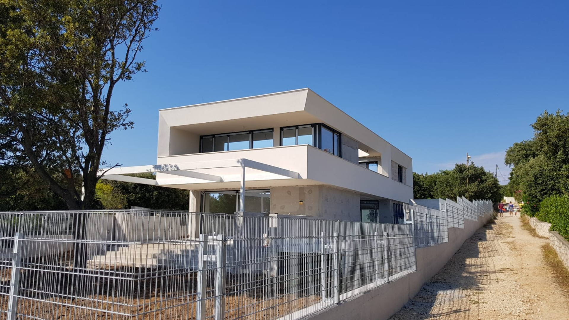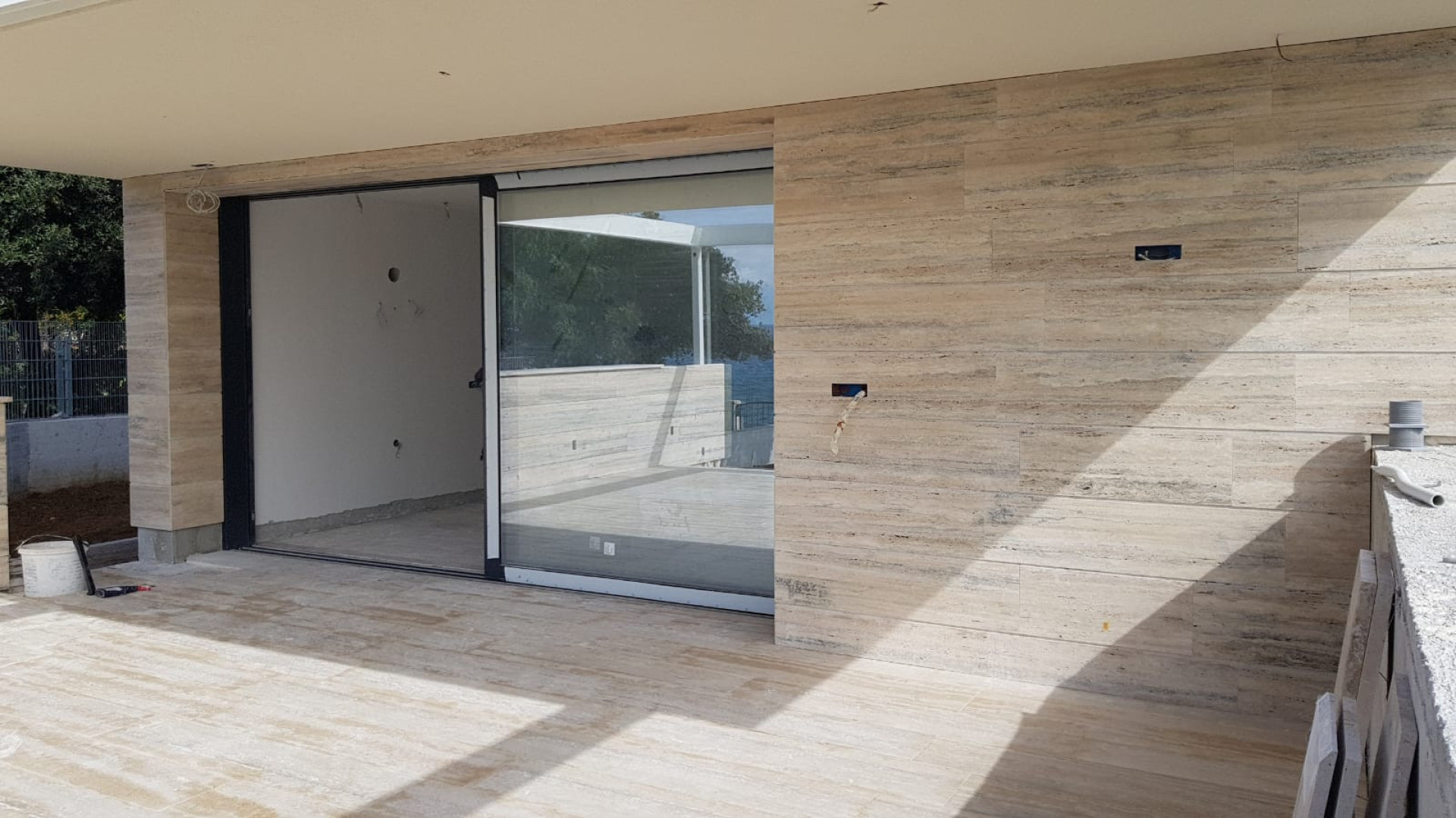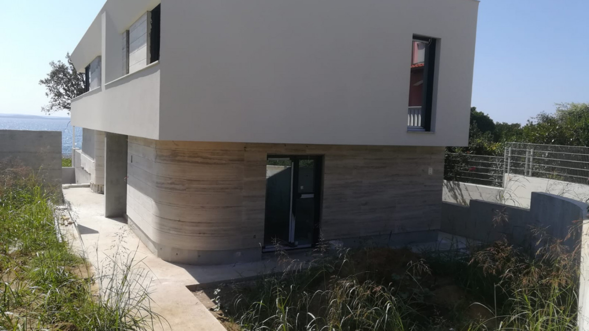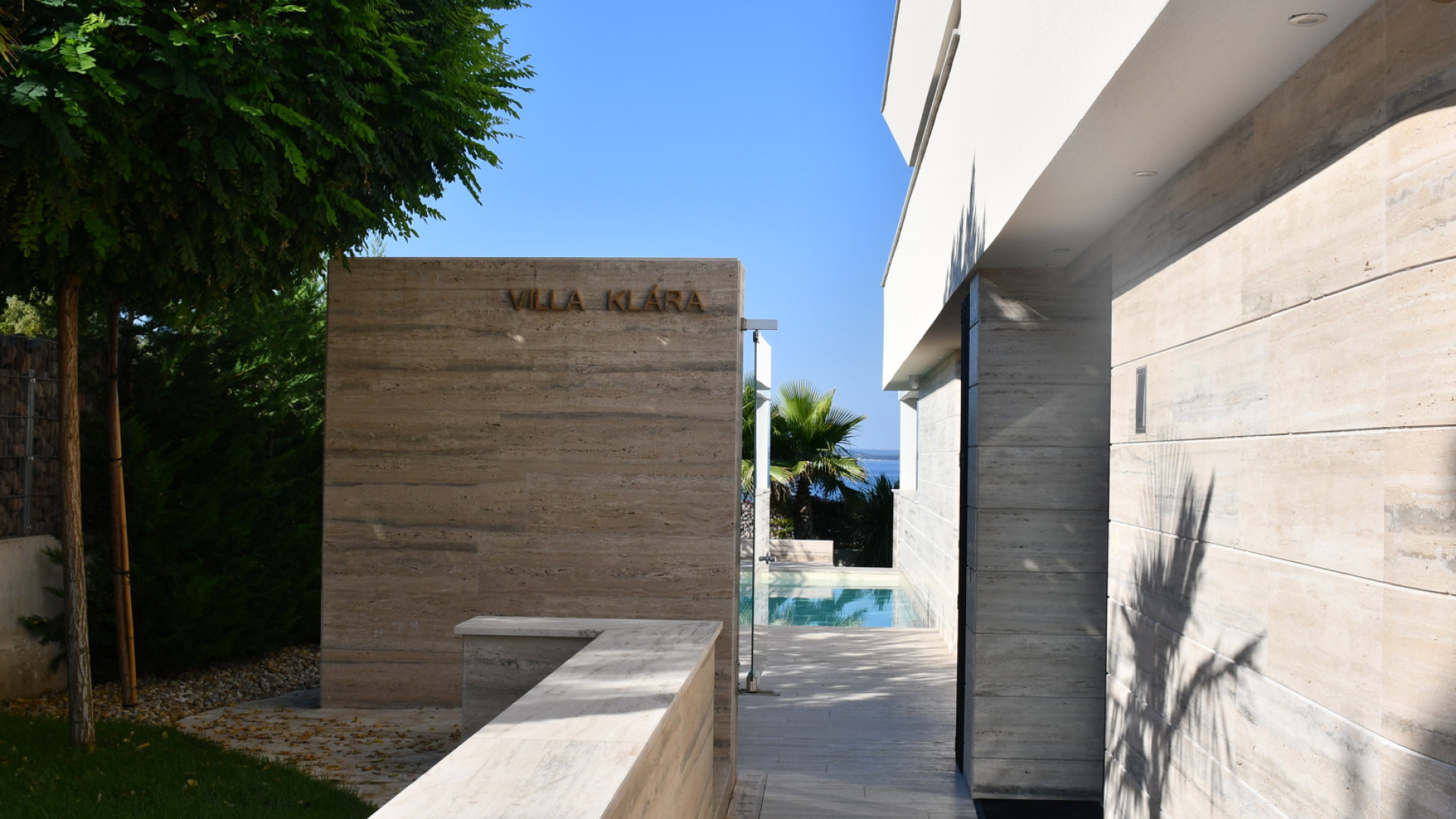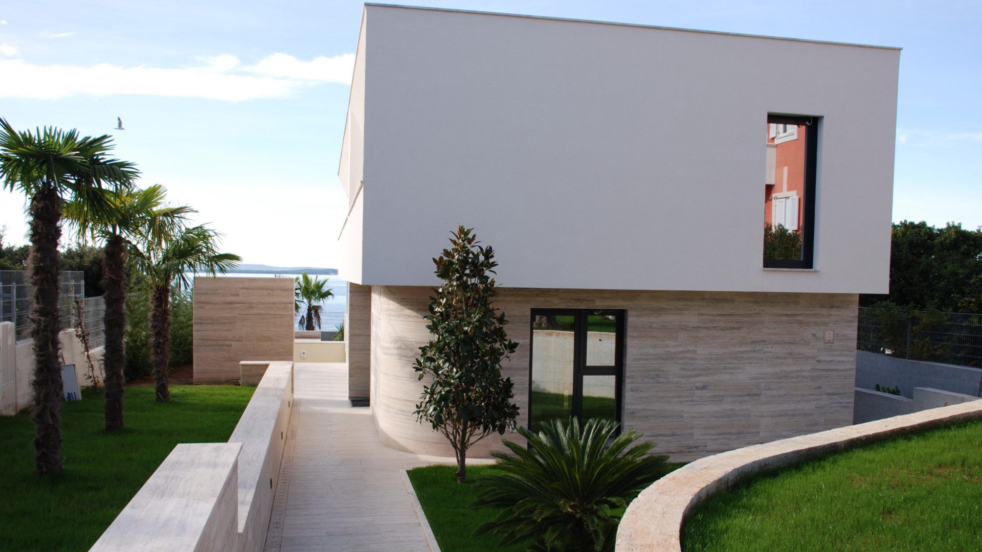 Ova luksuzna vila izgrađena je na zemljištu u prvom redu do mora, na mjestu gdje je nekada stajala stara kuća. Fasada je u velikom dijelu obložena traveritinom, što joj daje poseban i profinjen izgled. Zahvaljujući dugogodišnjem iskustvu investitora, vila nije samo estetski dojmljiva, već i funkcionalno osmišljena za ugodan život.