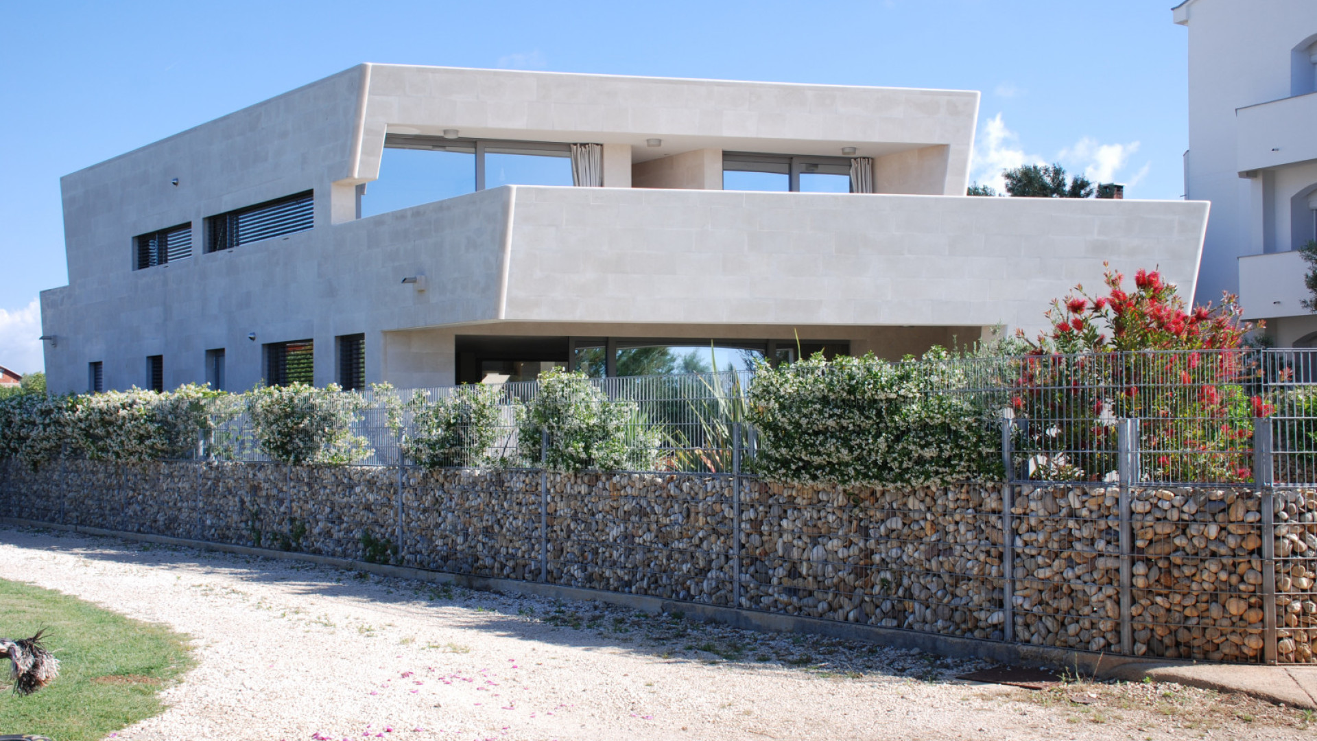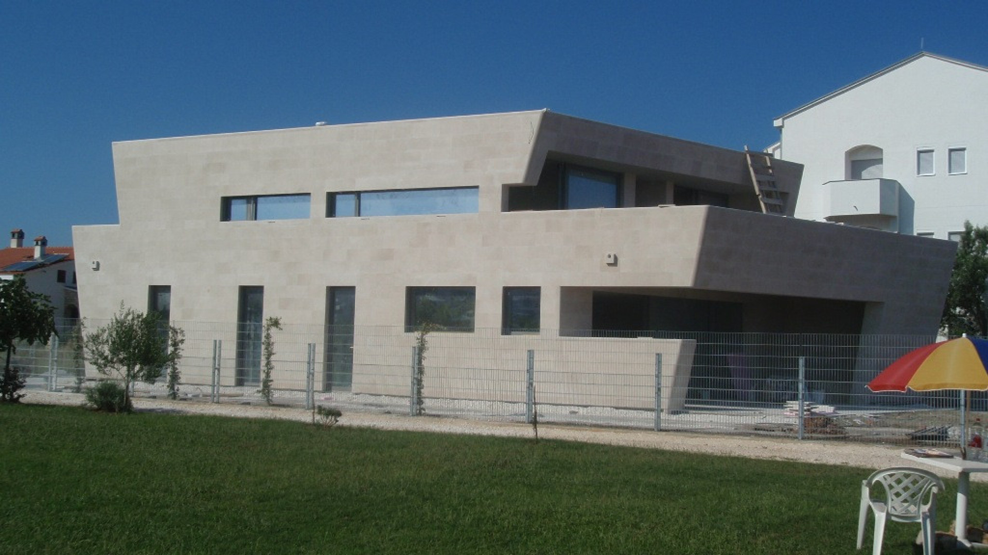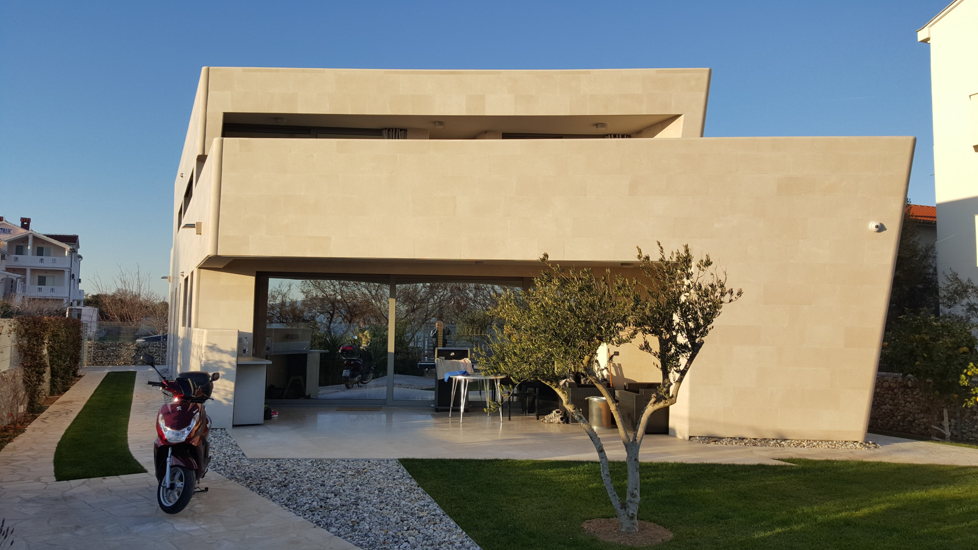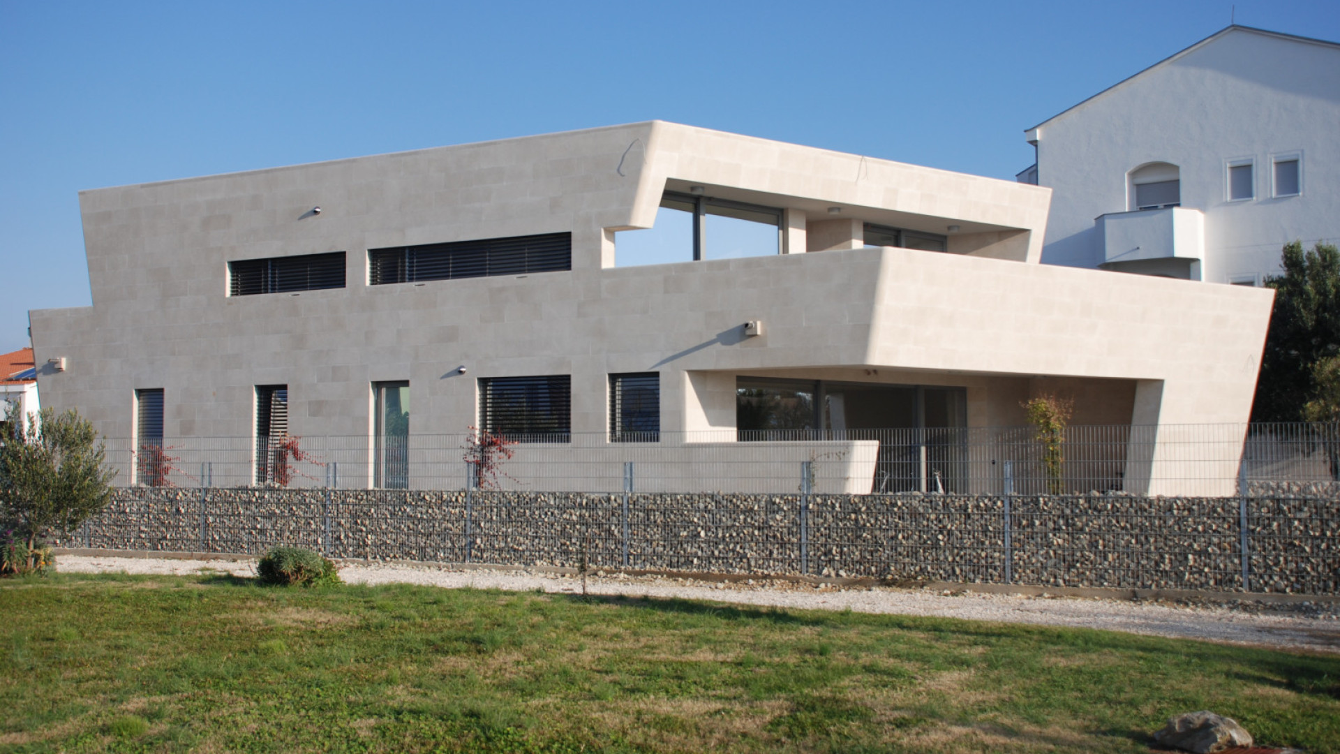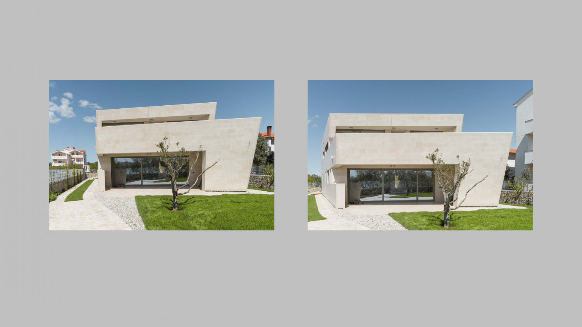 Ova jedinstvena kuća u Sukošanu djelo je arhitekta Zdeňka Fránka, dobitnika nagrade Arhitekt godine 2020. Obložena je lokalnim bračkim kamenom, koji se savršeno uklapa u mediteransku klimu i naglašava njezinu autentičnost. Posebnost kuće je i unutarnje atrijsko dvorište, pažljivo dizajnirano kako bi u njemu uvijek vladao ugodan hlad i prirodna ventilacija.